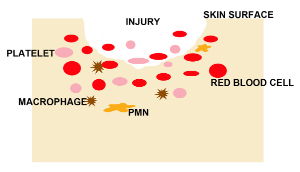 Plasma fluid & protein, antibodies, leukocytes and red blood cells enters the injured area.